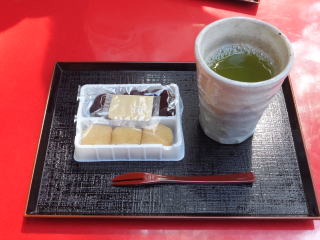 三保の松原入り口の茶店でいただいた、安倍川餅セット。価格が300円とワリとリーズナブルである。緑茶が、滅法、美味しかった。 |