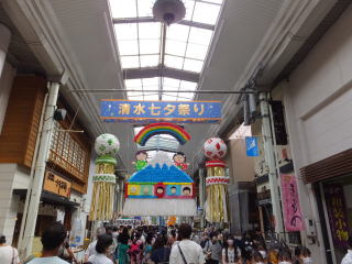 今年から、清水銀座の飾りつけは無くなり、駅東口と駅前銀座のみとなっていた。まあ、今の清水銀座を見れば、商店街とは程遠い通りとなっているから、宜なるかなの感は否めぬが、昔と違って寂しい限りではある。昔は、旧東海道の通りそのものである、清水銀座の方が華やかな印象があったのだが…。 |