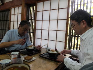 11:30。少々早いが、午餉がわりに蕎麦でも手繰ろうと謂う事になった。まじなかとうたさんは大根蕎麦、きどくんはカレー南蛮である。合間に3人で一串づつ五平餅に舌鼓を打つ。素朴な味わいだが、滅法、美味かった