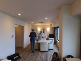 別館の最上階(6階)の大きな部屋に通された。室内は土足履きであり、畳の部屋が無いのが少々不満であるが、かなり広い。聞けばスイートルームとのとの事であり、眼前の諏訪湖の眺望が頗る良い。